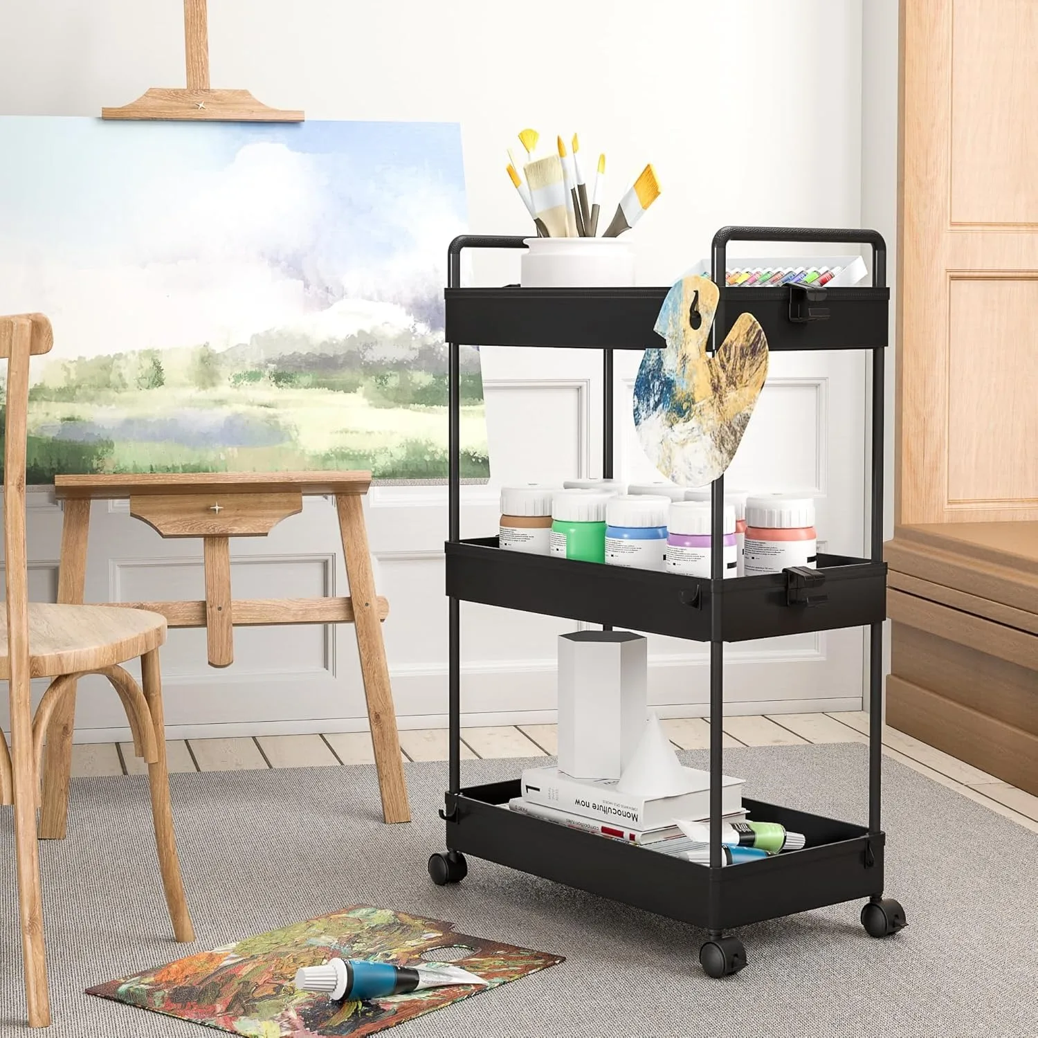 3 Tier Rolling Cart with Wheels and Handle,Rolling Storage Cart for Office, Living Room, Laundry Room,Kitchen,Bathroom,Black