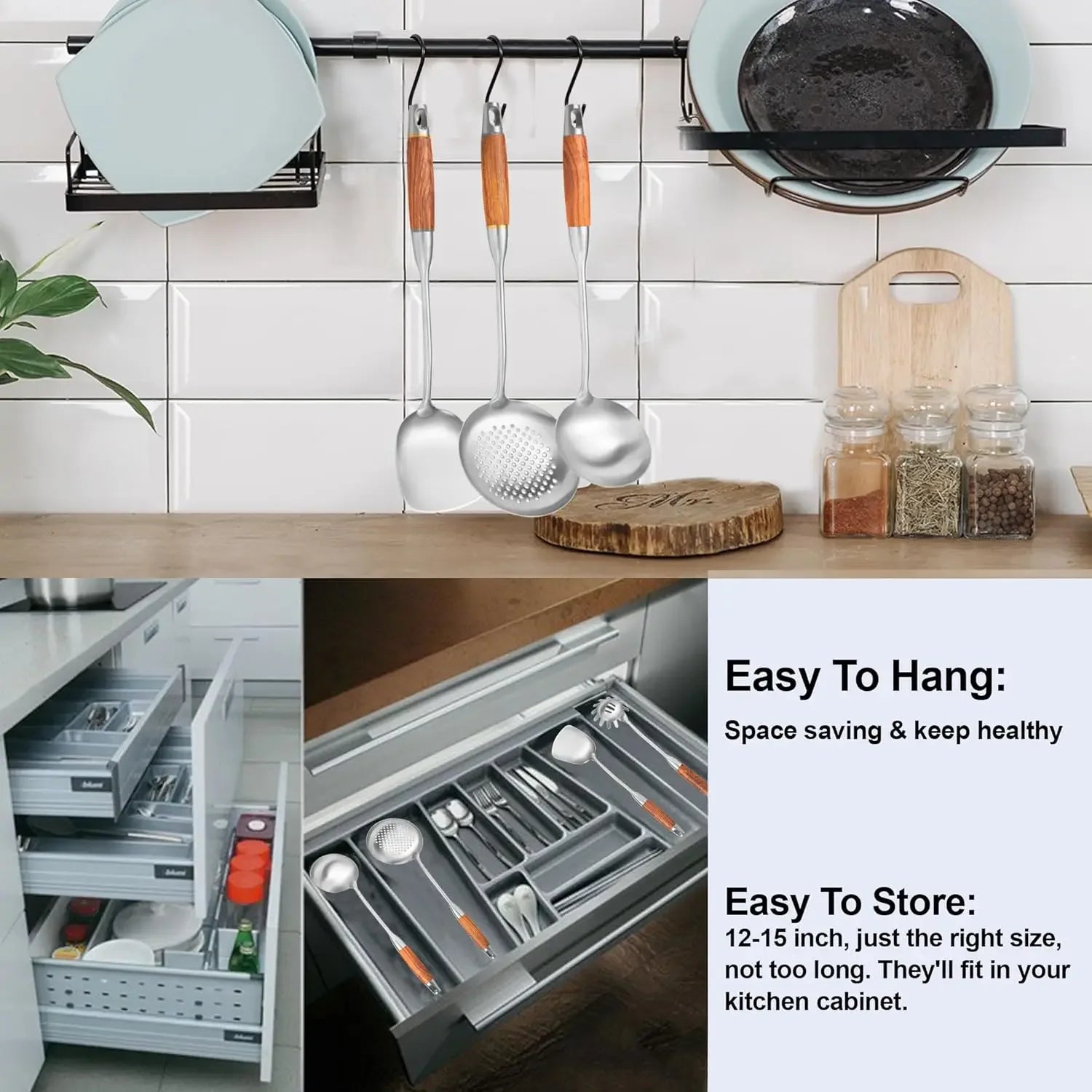 - Professional Kitchen Utensils Set: Clean lines, good weight and well balance. The wooden handles are not too heavy, help you eliminate stress on the arms and provide a comfortable ergonomic grip. Wooden handle reduce heat transfer, anti-scald, help you stay out of the soup or keep you away from the heat and flame.