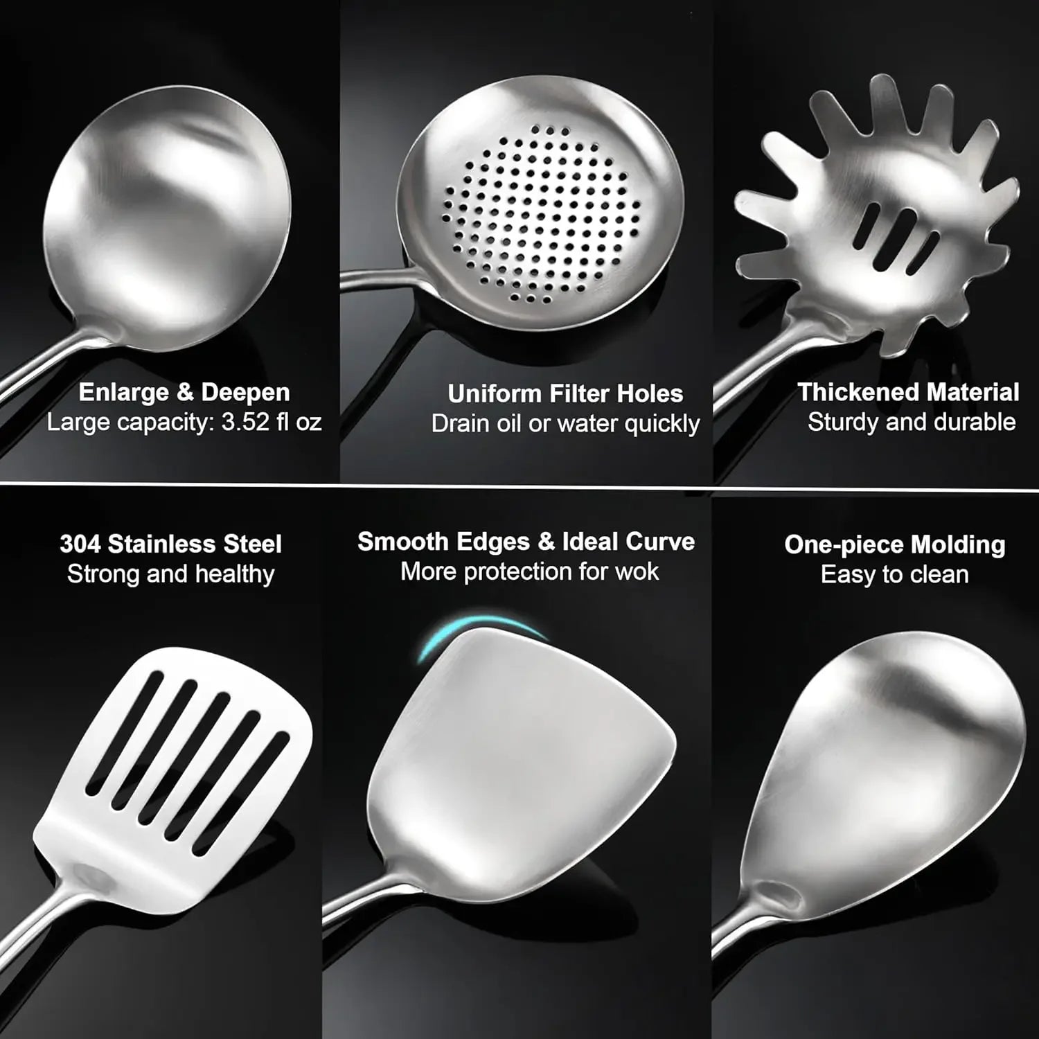 - Wide application: All in 1 utensils set. 1 spatula, 1 ladle, 1 skimmer, 1 slotted tunner, 1 spaghetti spoon, 1 large spoon, 1 fork, 1 solid spoon, 1 slotted spoon. The utensils are angled making it easy to cook with. Very usefull when you work with large batches in the kitchen. And they pair perfectly with stainless or carbon steel cookware.