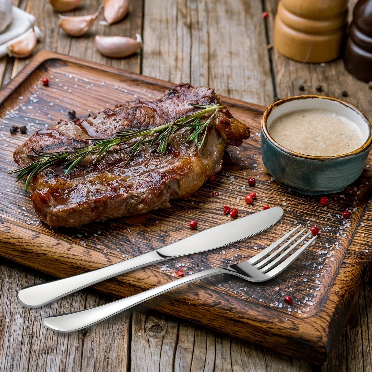 Easy to Clean and Dishwasher Safe: Elegant design and superior quality knife, fork and spoon, mirror polish utensil set not easy to collect stains and easy to care. Dishwasher safe, will not get damage by high temperature.