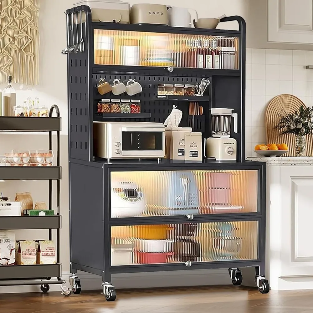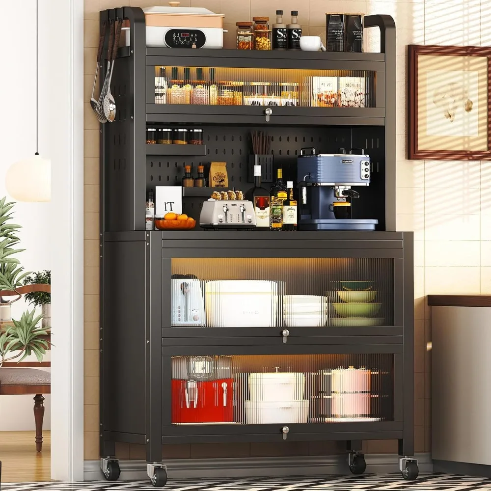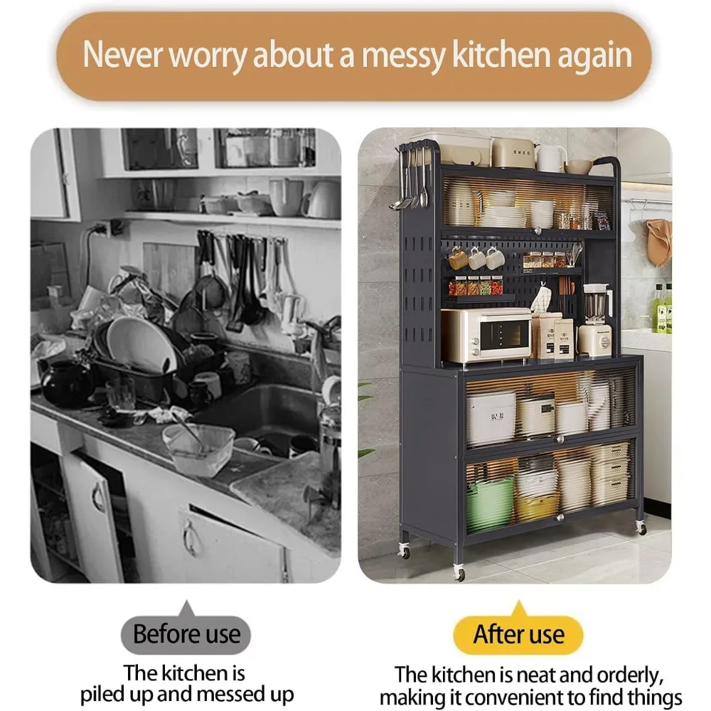 63 Inch Bakers Rack with Acrylic Door and Storage, Farmhouse Coffee Bar Cabinet, Microwave Stand Kitchen Cabinet with 8 S-Shaped
