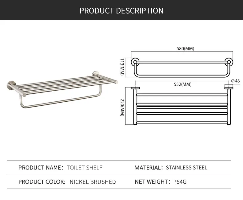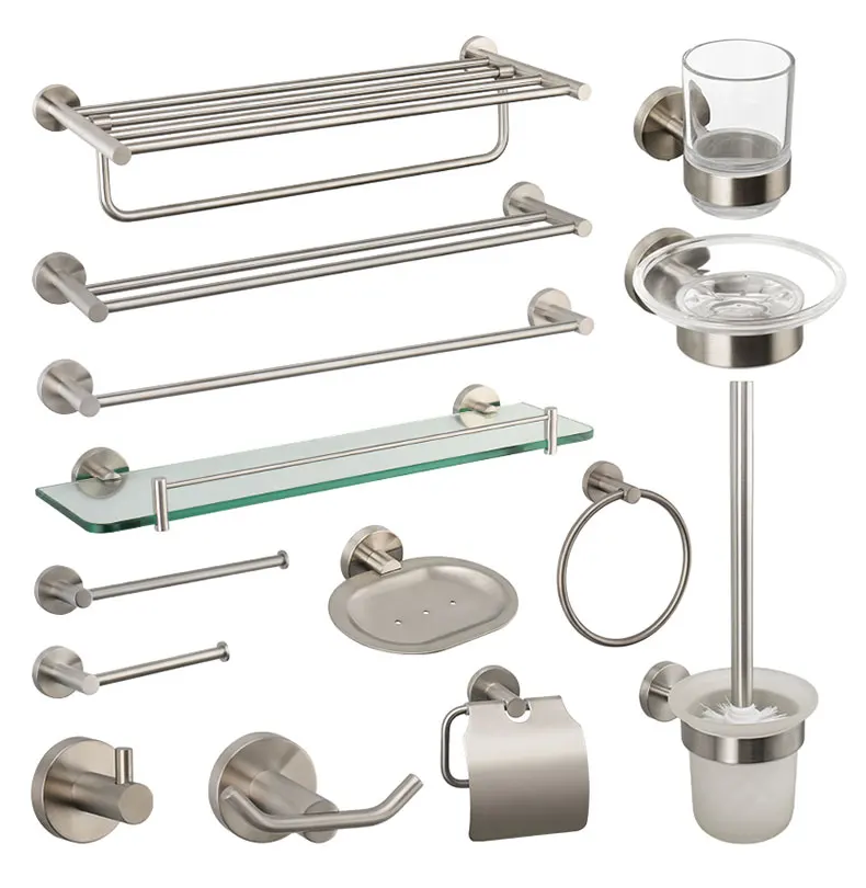 Brushed Nickel Bathroom Accessories Towel Bar Hooks Towel Rack Shelving Roll Paper Holder Toilet Brush Soap Dish Glass Shelf
