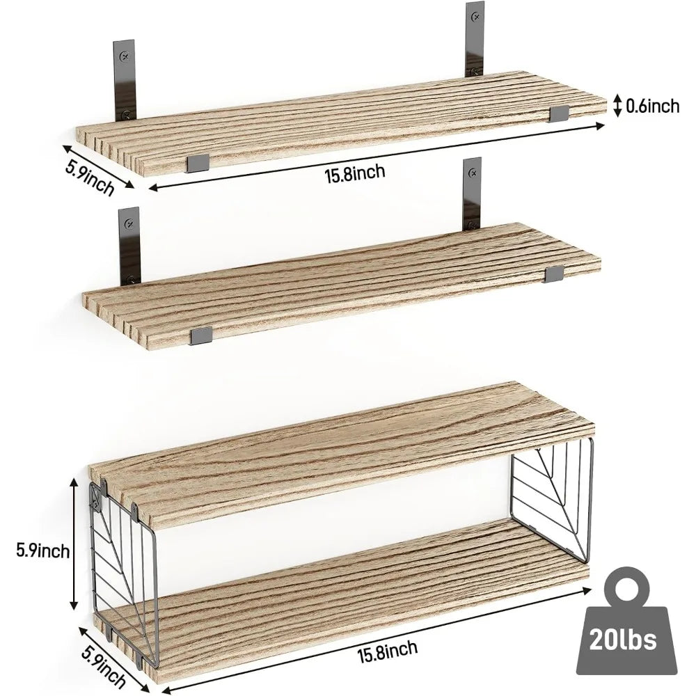 - [100% Natural Wood]- Crafted from high-quality paulownia wood, our floating shelves feature an elegant texture and excellent durability. The wood boards undergo careful carbonization and fumigation processes before being coated with varnish to prevent moisture. This treatment ensures that the product is harmless, acid-resistant, heat-resistant, and easy to clean. The premium rustic wood showcases the farmhouse style, bringing a touch of nature to your home.