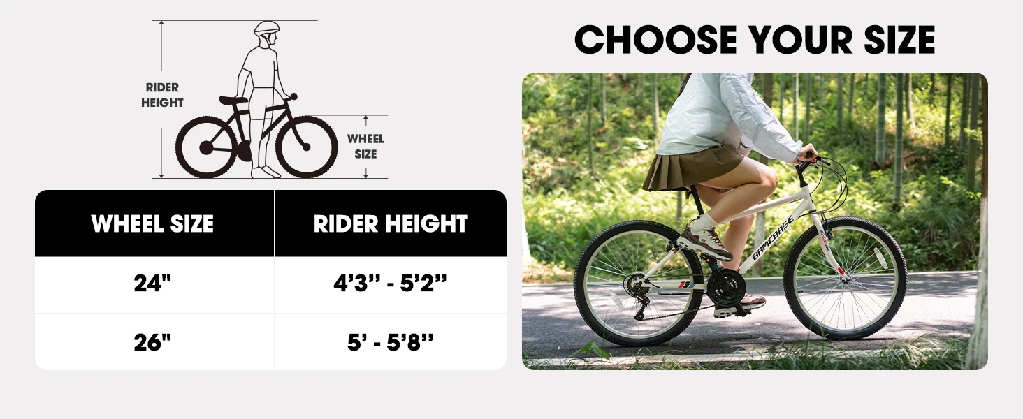 Entry-Level Performance: Tailored for newcomers to the world of mountain biking, making a balance between affordability and functionality; 26 in mtb fits riders between 5'-5'8''; 24 in bike fits riders between 4'3''-5'2''