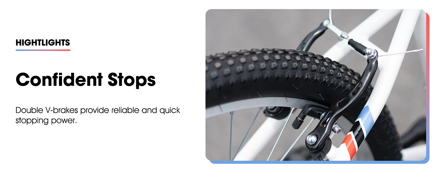 Dependable V-brake System: V-brakes deliver reliable stopping power, making them easy to maintain and adjust, ideal for beginners learning the fundamentals of brake control in outdoor environments