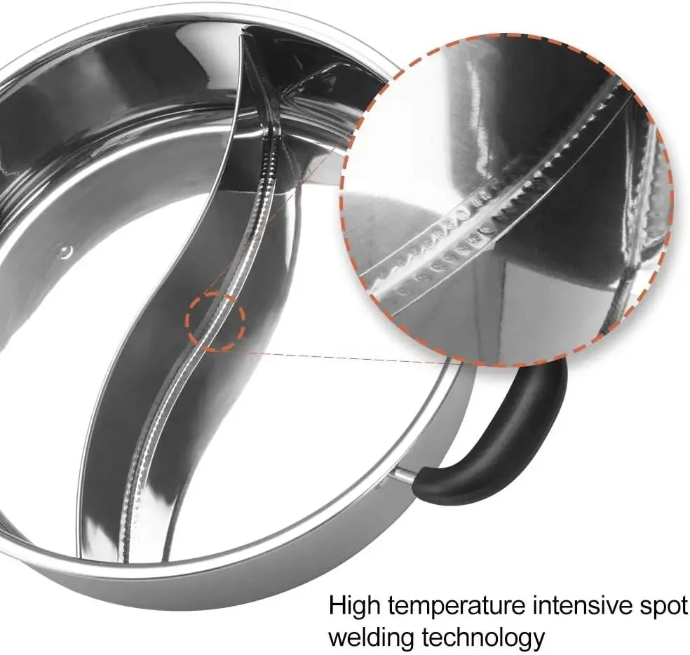 - YUANYANG POT DESIGN: Dual sides divider design for two different flavors, high encryption spot welding procedure, not easy to leak. This is a very healthy and fun way to eat your veggies, seafood, and proteins.