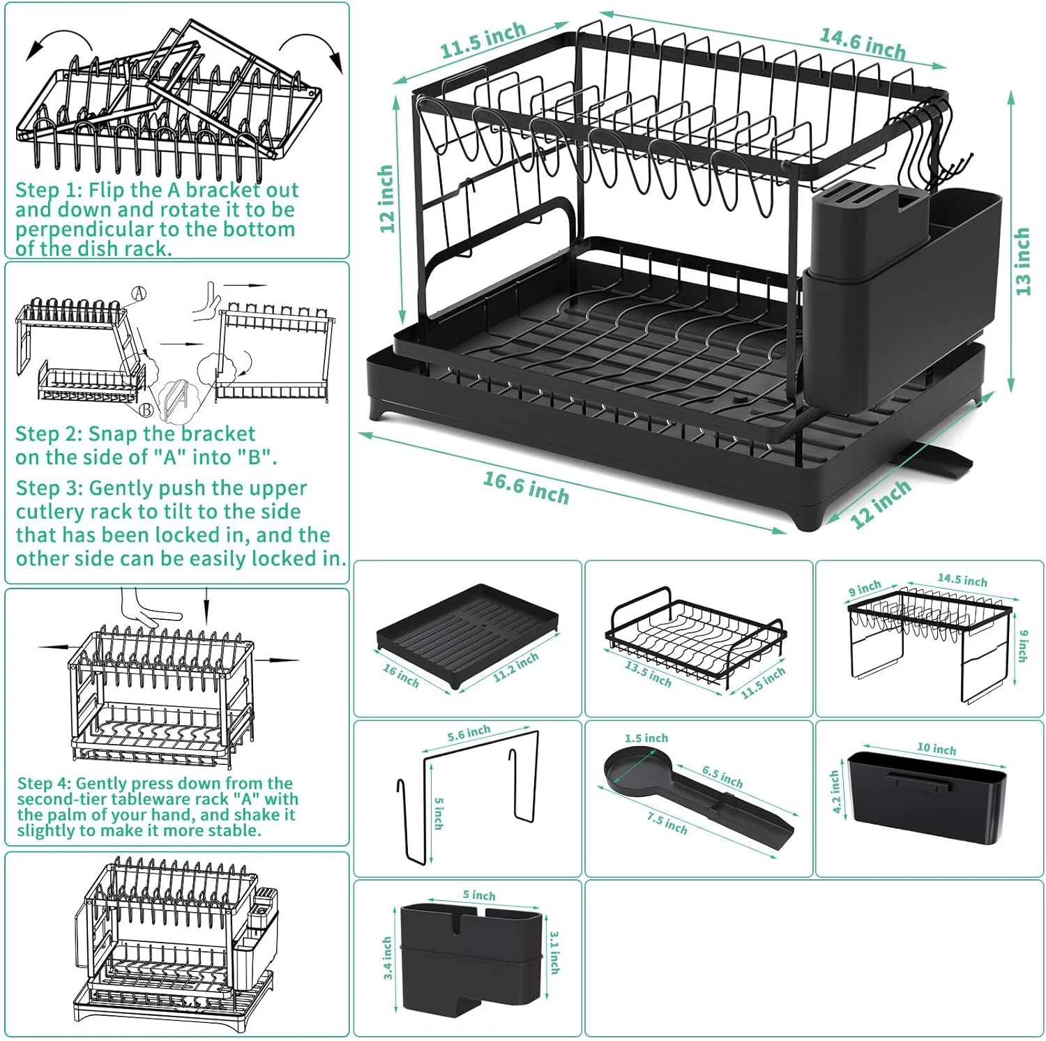 Kitchen countertop 2-tier dish drying rack, kitchen countertop dish drainer with drip tray, metal kitchen dish rack with drip tr