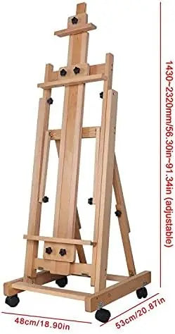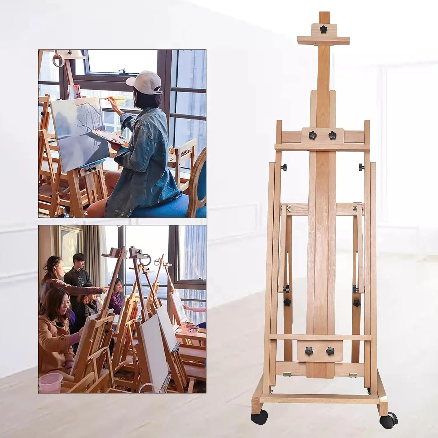 Portable Collapsible H-Frame Easel , Solid Beech Wood Large Artist Painting Easel, Tilts Flat Movable Floor Stand with 4 Wheels