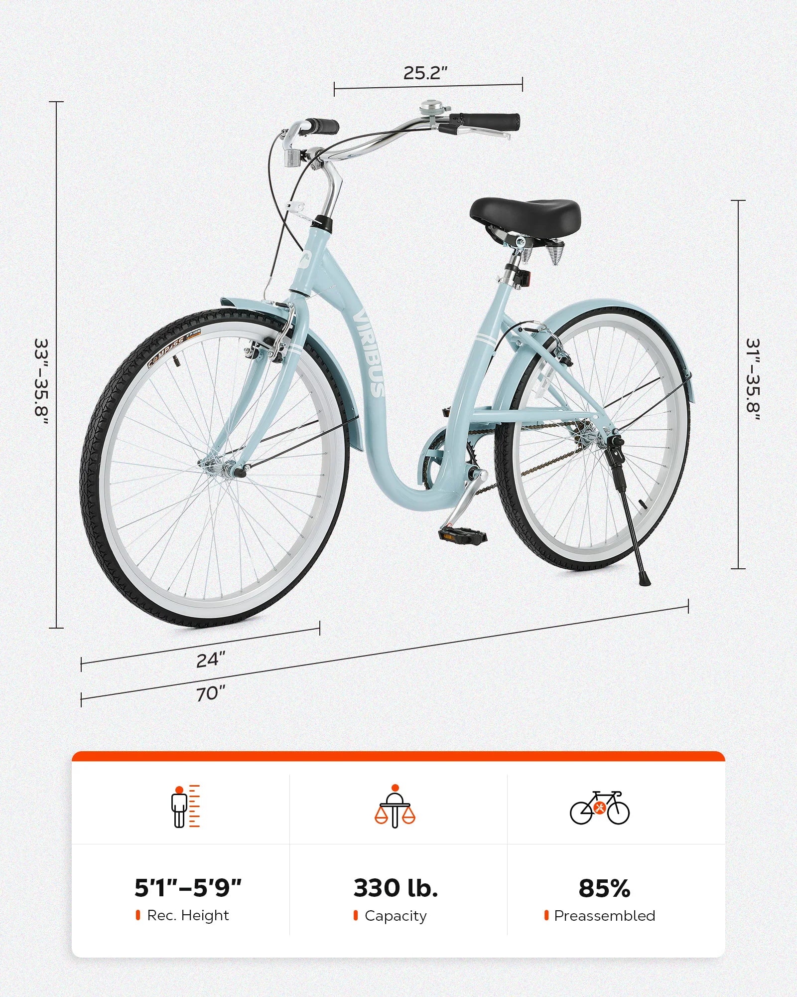 Stylish Cruising Companion: Available in 24" and 26" wheel sizes, this Viribus women's cruiser bike blends chic style with everyday functionality, making it perfect for both leisurely rides along scenic routes and quick errands around town