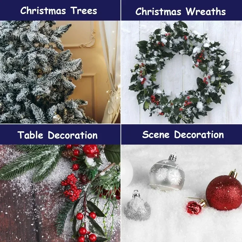 Widely used: These white artificial snow are very suitable for decorating houses, Christmas trees, shelves, tables, windows, and fireplaces; Create a dreamy appearance with Christmas fake snow powder in your Christmas village or other holiday displays.