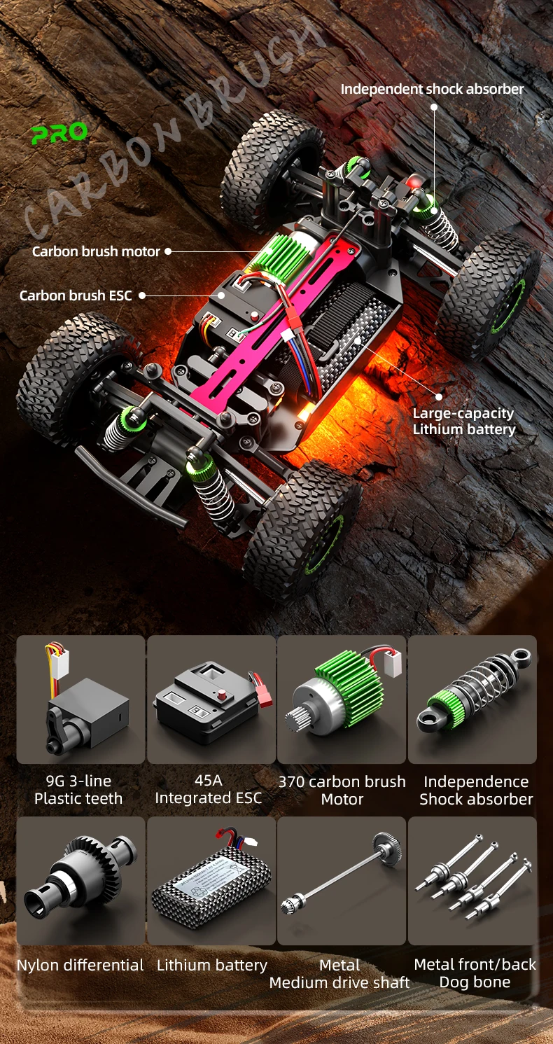 1, the use of simulation structure design, with a real car control feeling, to achieve the full ratio of stepless speed, high speed, rapid acceleration, deceleration, braking, reversing, left turn, right turn;